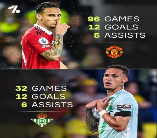 雷速体育10月19日报道宣称 根据统计,安东尼在贝蒂斯32场比赛参与的进球数,已经超越了此前他曼联生涯96场比赛的数据。此前在曼联效力96场,安东尼打入12球并有5次助攻,总计参与1